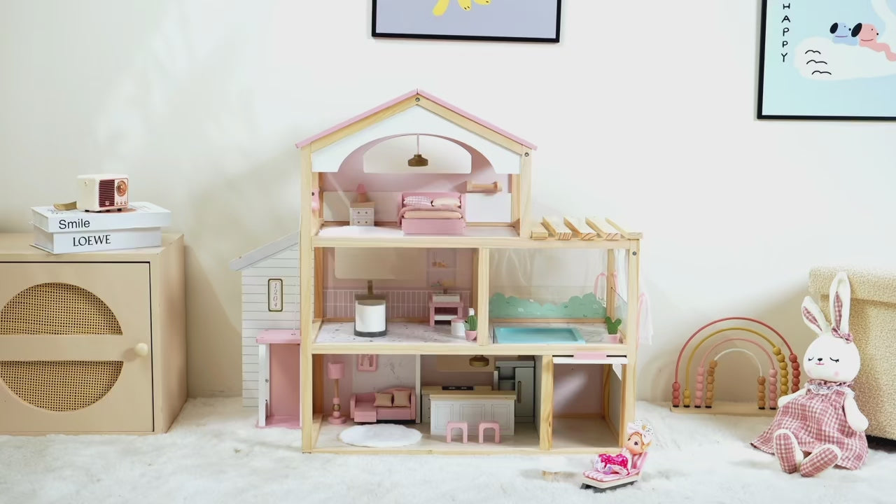 The Luxury Villa Dollhouse is built from solid wood to last generations — a heirloom-quality piece that grows with your child's imagination. With a working elevator, swimming pool, garage, and fully furnished rooms, every detail invites hours of open-ended, screen-free play.